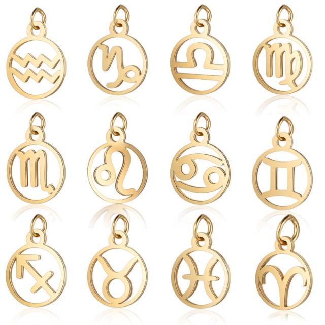 金色にゴールドメッキした丸型のネームタグやドッグタグのようなプレートに12個の星座をデザインしたステンレス製のチャームパーツ。