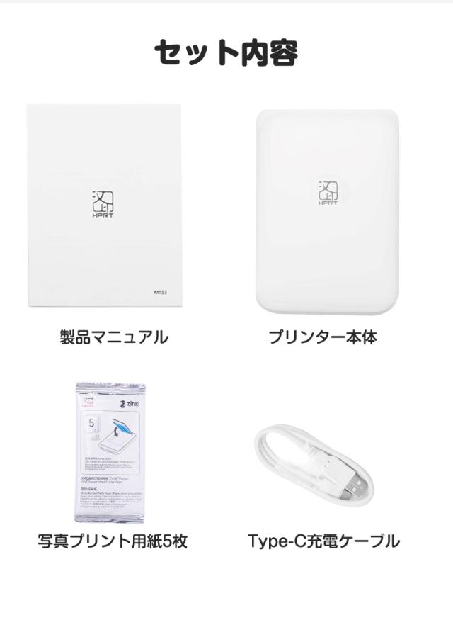 【セット内容】フォトプリンター本体*1、プリント用紙*5枚、Type-C充電ケーブル*1、取扱説明書*1、パッケージ*1
