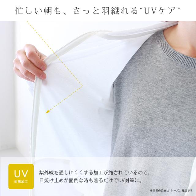紫外線を通しにくくする加工が施されているので、日焼け止めが面倒な時も着るだけでUV対策に。また、冷房が効いている室内の羽織りものとしても最適です♪