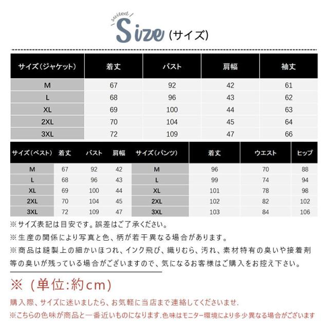 商品詳細:カラー:/A01/A02/A03サイズ:/M/L/XL/2XL/3XL■商品説明豊富なサイズとカラー展開で、あなたにピッタリの一着が必ず見つかりますビジネスからパーティーシーンまで幅広く活躍するの3ピーススーツがお買い得一着あると様々なスタイルコーデに重宝し、オシャレに幅が広がる着まわし力抜群■素材ポリエステル、その他■注意事項※モデル画像は環境光の影響によりカラーが異なって見える場合がございます。※採寸は製造メーカー提供情報ですので、1~3cm誤差が生じる場合がございます。※イメージ違い・サイズ感での御返品にはお応え出来ません。以上の点を予めご了承下さい。■関連キーワードシングルスーツ ベストつきスリーピー 黒 グレー ブラック ネイビー ストライプ シャドーストライプ 秋冬 春 ドレスアップスーツ 結婚式 入学式 卒業式 個性的 パパスーツ オシャレスーツ ホスト ヤクザスーツ 衣装 大きいサイズ ツータック