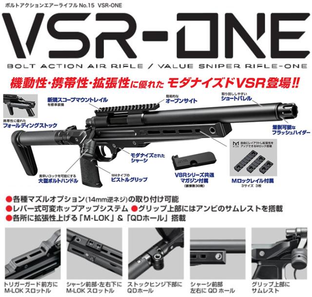 1発ずつ手でボルトを引き、再び戻して次弾の発射準備を行うボルトアクションエアーライフル・シリーズに、東京マルイ・オリジナルデザインのVSR-ONEが登場。信頼性の高いVSR-10のメカをベースに、拡張性が高い流行のスタイルを取り入れ操作性や機動性をアップした、モダナイズドモデルとなっています。■近代化したVSR-10M-LOKレイルシステムやQDホールを採用したシャーシ、オープンサイト付きのマウントレイル、大型ボルトハンドルやM4タイプのピストルグリップなど、各所を近代化。また、バレルは取り回しやすいショートバレルを採用し、フォールディングストック搭載で携帯性にも優れています。■ボルト操作を再現ボルトを引いて戻すことで次弾を装填。一連の動作からスナイパーの緊迫感や臨場感を感じることができます。また、大型のボルトハンドルを採用したことで、素早いコッキングが可能になっています。■精悍なブラックスタイル光の反射をおさえたつや消し仕上げとブラックで統一されたカラーが、スナイパーライフルとしての精悍さを演出しています。■トリガープル調整金属製のトリガーユニットによって、シャープなトリガーフィーリングを実現。トリガーの重さやストローク距離は、好みに応じて調整することができます。■BOX型マガジン採用装弾数30発、ワンプッシュで素早いマガジンチェンジが可能なBOX型マガジンが付属します。■各種オプションパーツに対応14mm逆ネジ仕様のサイレンサーや、光学機器、20mm幅(ピカティニー規格)に対応したフラッシュライトやバイポッドなど、様々なオプションパーツに対応しています。