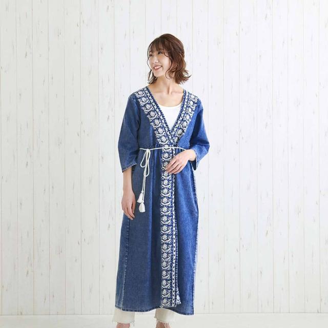 デニム ロングカーディガン 羽織 刺繍 コットン 春夏 リゾート ロングドレス