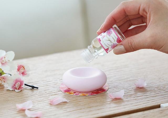 アロマオイルを直接2〜5滴たらして置くだけ。玄関や洗面所などの小空間で、桜の香りが心地よく広がります。 |