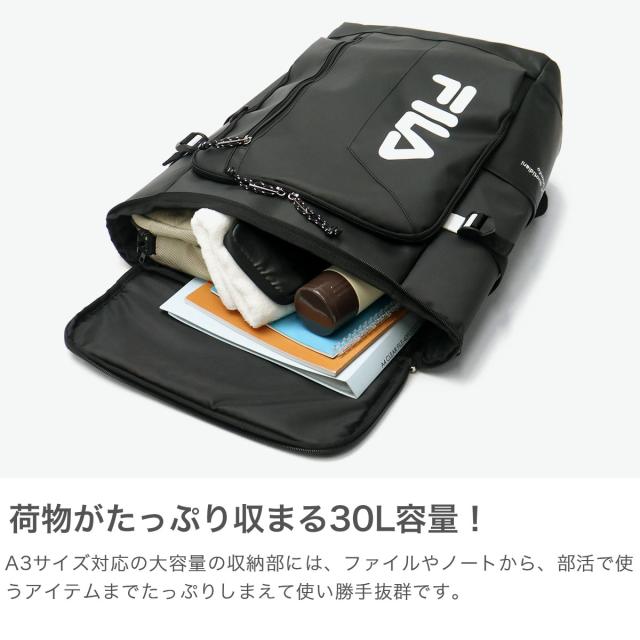 フィラ FILA レディース メンズ 大容量 通学 リュックサック 軽量 軽い おしゃれ ボックス型 通学用 大きめ 黒 高校生 中学生 部活 スクールバッグ 通学リュック 30L A3 B4 PC収納 17inch 17インチ サイン fila リュック デイパック バッグ バックパック ボックスリュック スクエアリュック 背負い 通学カバン 通学バッグ スクエア型 A3サイズ B4サイズ A4 A4サイズ 30リットル PC パソコン収納 ノートPC タブレット収納 タブレット 女子 男子 男女兼用 学生 スクール スポーツ 旅行 トラベル デイリー スポーティ カジュアル 大きい 撥水加工 撥水 はっ水 かわいい 可愛い オシャレ 人気 ブランド ブラック ユニセックス A3サイズ収納可能 ファスナー式 雨や汚れに強い 別注色 当店限定色
