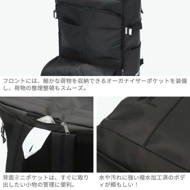 スポーツライフスタイルブランド『FILA/フィラ』のスクエアリュック。ボディには撥水加工を施しているので水や汚れに強く、毎日気兼ねなくお使いいただけます。30L容量で荷物をたっぷりと収納でき、1泊程度の旅行にも活躍します。背面側のサイドファスナーを開けると、メインに直接アクセスできる便利なつくりがポイントです。内装にはクッション付きのPC収納、外側にはミニポケット等の収納スペースが充実しており、より使い勝手を高めてくれるデザインになっています。