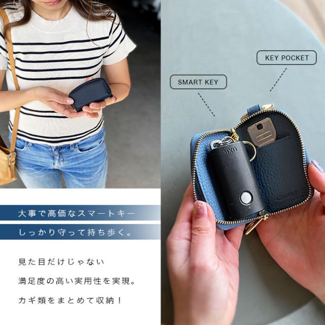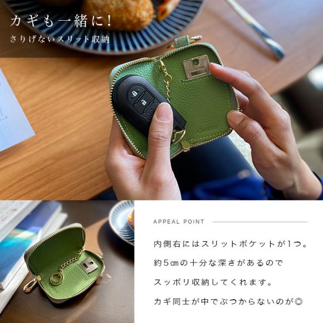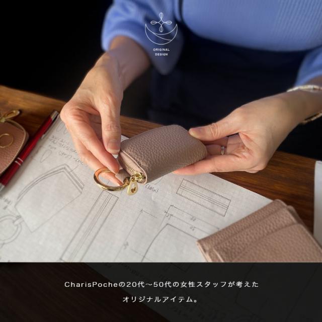 Charis Poche 人気ウォレット【女性が欲しかった小さい財布】シリーズと同じ革を使用し、お財布とセットで合わせて使えるようにデザインしたCharis Pocheオリジナルの本革製スマートキーケースです。本革ならではのシボ感が楽しめるシュリンクレザーを使用しており、老若男女問わず選びやすい豊富な10カラーをご用意しました。カリスポシェの特徴的な緩いカーブデザインがファスナーで表現されたラウンドファスナー式となっています。スマートキーを収納するのにぴったりのサイズになっており、丸型カラビナでバッグの持ち手やベルトループなどに接続可能です。中のスリットポケットは鍵を1つ収納できるサイズ感。ロッカーの鍵などちょっとした際に便利です。