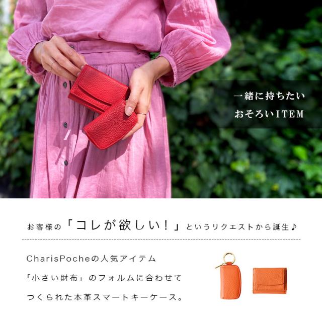 | 商品説明 | Charis Poche 人気ウォレット【女性が欲しかった小さい財布】シリーズと同じ革を使用し、お財布とセットで合わせて使えるようにデザインしたCharis Pocheオリジナルの本革製スマートキーケースです。本革ならではのシボ感が楽しめるシュリンクレザーを使用しており、老若男女問わず選びやすい豊富な10カラーをご用意しました。カリスポシェの特徴的な緩いカーブデザインがファスナーで表現されたラウンドファスナー式となっています。スマートキーを収納するのにぴったりのサイズになっており、丸型カラビナでバッグの持ち手やベルトループなどに接続可能です。中のスリットポケットは鍵を1つ収納できるサイズ感。ロッカーの鍵などちょっとした際に便利です。 |