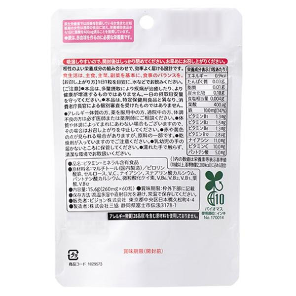 | 原材料 | 名称:ビタミン・ミネラル含有食品 マルチトール(国内製造)/ピロリン酸鉄、セルロース、ビタミンC、ナイアシン、ステアリン酸カルシウム、パントテン酸カルシウム、微粒酸化ケイ素、ビタミンB6、ビタミンB2、ビタミンB1、葉酸、ビタミンB12 |