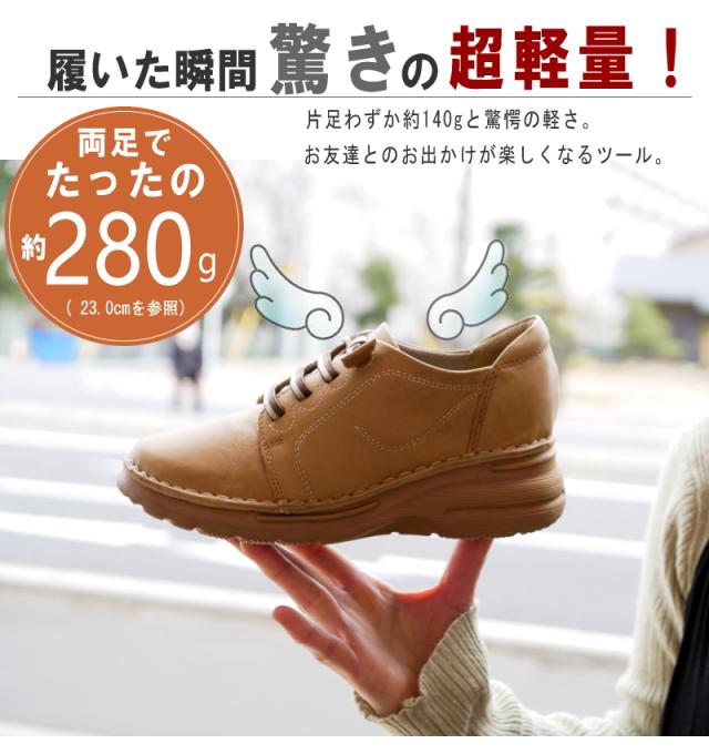 レースアップシューズ レザー 本革 靴 レディース 超軽量 ゴム紐 コンフォート ウエッジソール ラウンドトゥ 幅広 4e 黒 キャメル アイボリ 履きやすい 歩きやすい 疲れにくい 旅行 プチプラ
