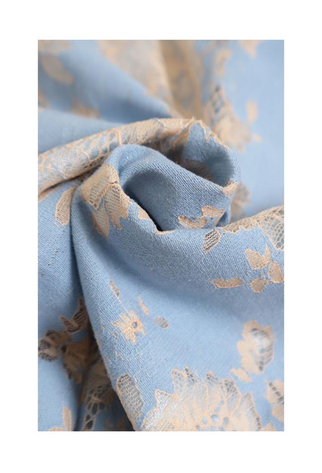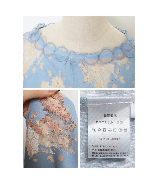 着丈はヒップが半分隠れるくらい、袖は長いところで六分くらい、短いところで肘がのぞくくらいでした。レース部分に透け感があり、身頃は裏地がついているので一枚で着られました。水色の部分は麻のような風合いで、少しシャリ感がありました。袖はベルスリーブを斜めにカットしたようなデザインで、内側が長めです。首元は、少し横に広めに開いています。裾はインでもアウトでも、ボトムもパンツでもスカートでも合わせやすそうだと思います。