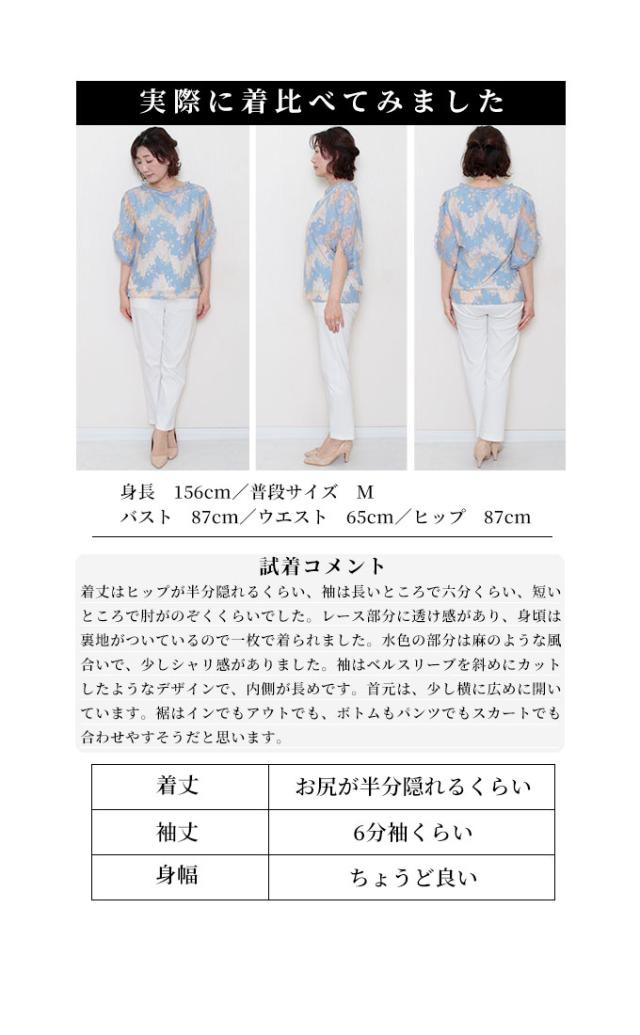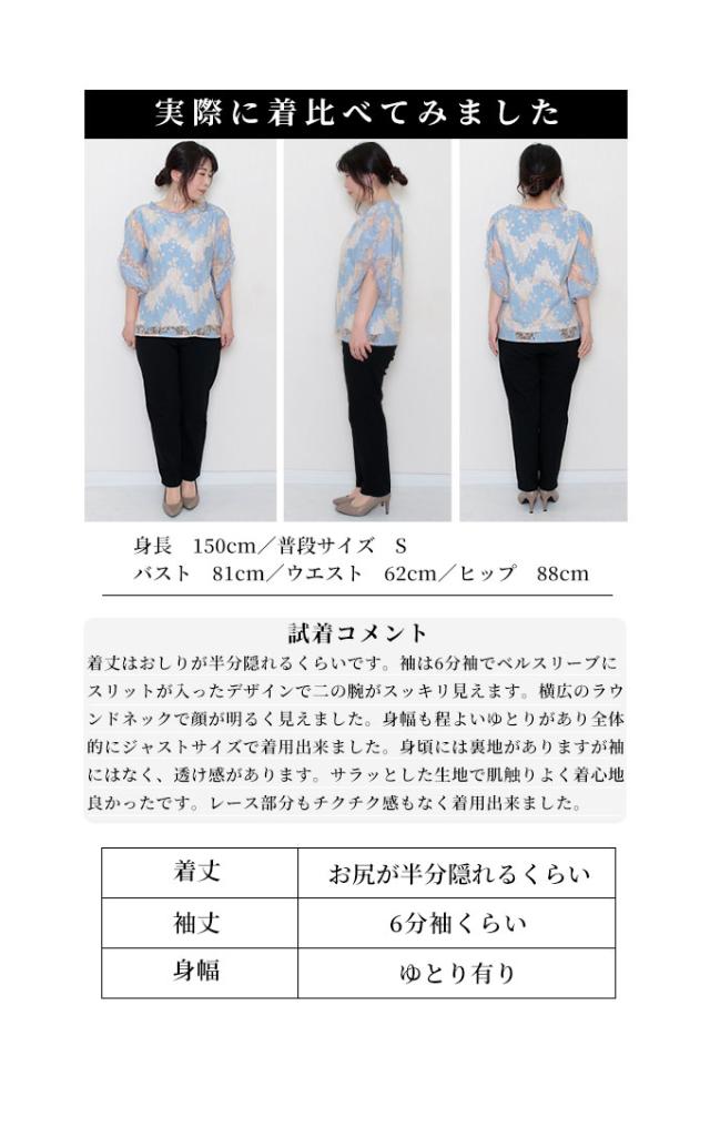 着丈はおしりが半分隠れるくらいです。袖は6分袖でベルスリーブにスリットが入ったデザインで二の腕がスッキリ見えます。横広のラウンドネックで顔が明るく見えました。身幅も程よいゆとりがあり全体的にジャストサイズで着用出来ました。身頃には裏地がありますが袖にはなく、透け感があります。サラッとした生地で肌触りよく着心地良かったです。レース部分もチクチク感もなく着用出来ました。