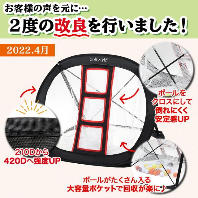 【安定感抜群のアプローチネット】ボールをたくさん入れても倒れにくい構造で、効率的に練習ができます。的から外れてしまっても大きなサイドネットがボールの散乱を防ぎます。