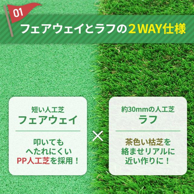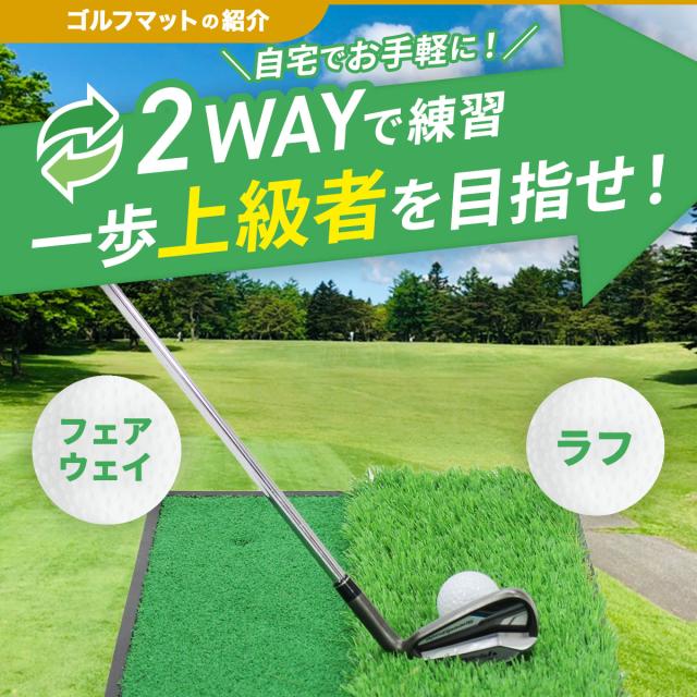 【頑丈なゴム製2WAYゴルフマット】フェアウェイとラフの二通りの人工芝を使用しているため、一枚二役としてどちらの芝でも練習できます。コンパクトなサイズで置く場所を選びません。