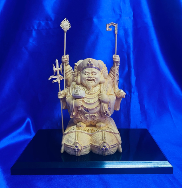 天然檜から手彫りで彫りあげられた三面大黒天像です。 三面大黒天とは、真ん中に大黒天・向かって右に弁財天・左に毘沙門天の二天がその背後から両手と顔をのぞかせる三天合体の像で最強の天部です。これら単独でも強力な三神が一体になったとき、強力なパワーが生まれるのです。