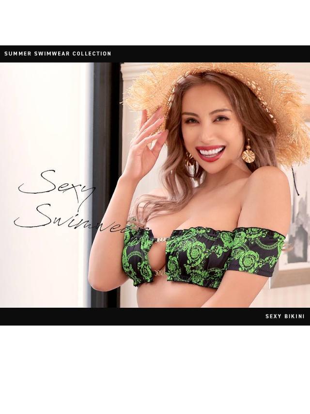 ☆バストのカッティングから覗く谷間がセクシーなスカーフ柄ビキニはデコルテと肩ラインをすっきり魅せるオフショルが二の腕のカバーも叶える袖付きビキニ♪