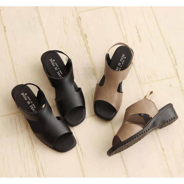 スクエアトゥにサイドオープンデザインがヌーディーで美しい足元を演出する、トレンド感漂うミュールサンダル。