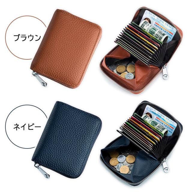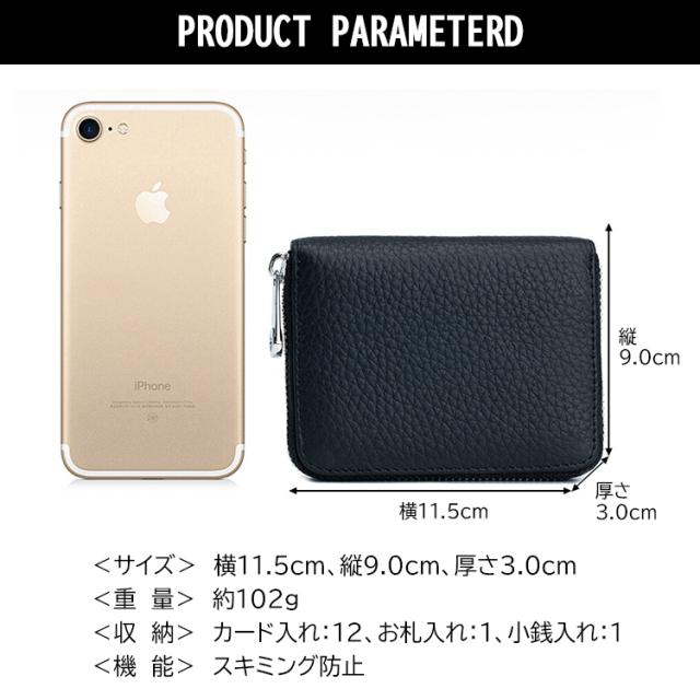 | ブラック ブルー ピンク ベージュ レッド グリーン ブラウン ネイビー | ●サイズ(約) 横11.5cm×縦9.0cm×厚さ3.0cm ●重量(約) 102g ●素材 外側:ソフトレザー(牛革) 内側:牛革、ナイロン ●仕様 カード収納×12 小銭入れ×1 フリーポケット×1 |