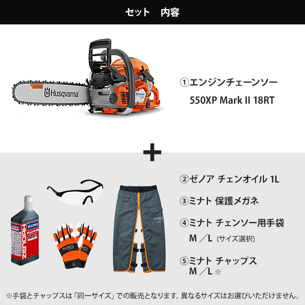 ハスクバーナ エンジンチェーンソー 550XP Mark II 18RT 5点セット (チェンオイル・保護メガネ・チェンソー用手袋・チャップス)