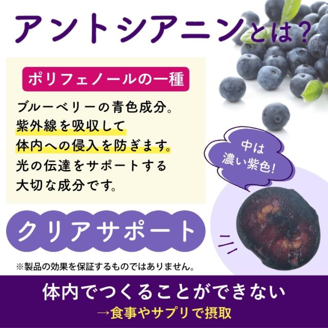 | 栄養成分表示(2粒中) | エネルギー 2.3Kcal、たんぱく質 0.004g、脂質 0.03g、炭水化物 0.5g、食塩相当量 0.0g、アントシアニン 25mg、ブルーベリーエキス 60mg、ルテイン 8mg、ビタミンE 7mg |