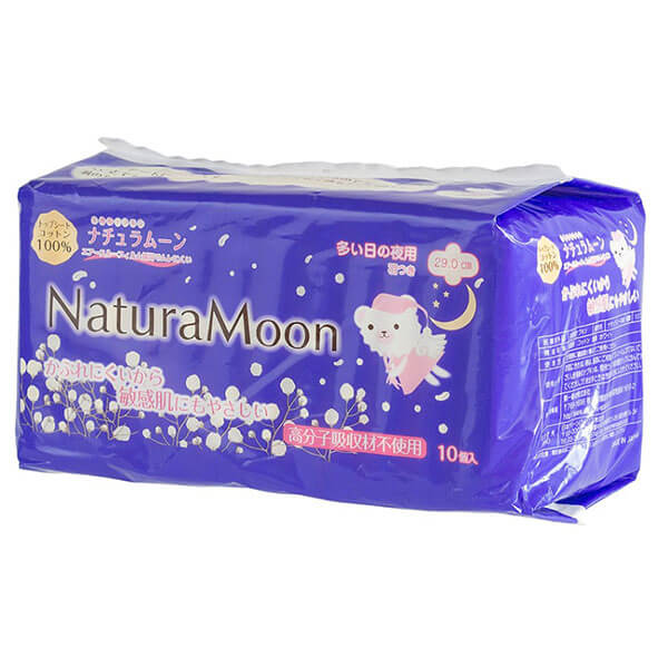 ナチュラムーン・生理用ナプキン夜用(羽付き)は、高分子吸収剤不使用、トップシートにコットンを100%使用。