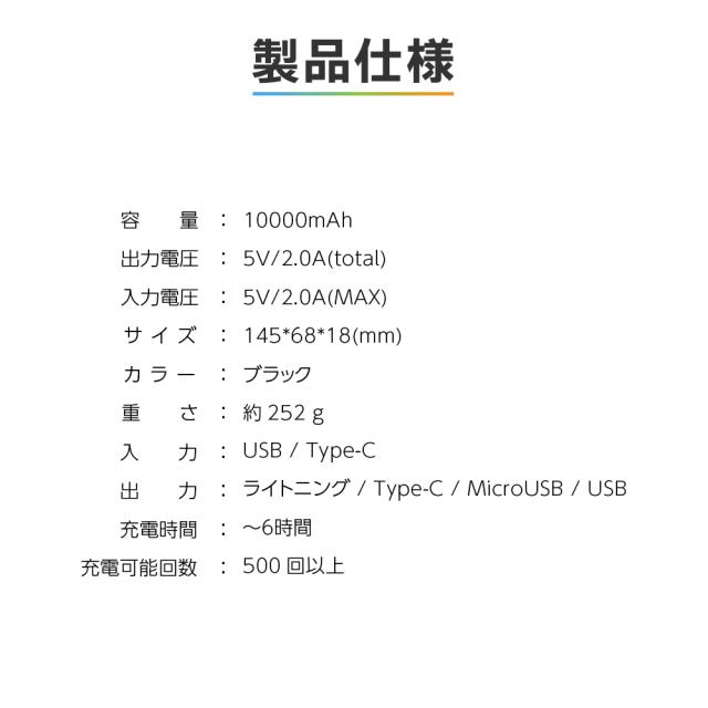 出力端子 : ライトニング,Type-C,MicroUSB,USB/5V/2.0A(MAX)