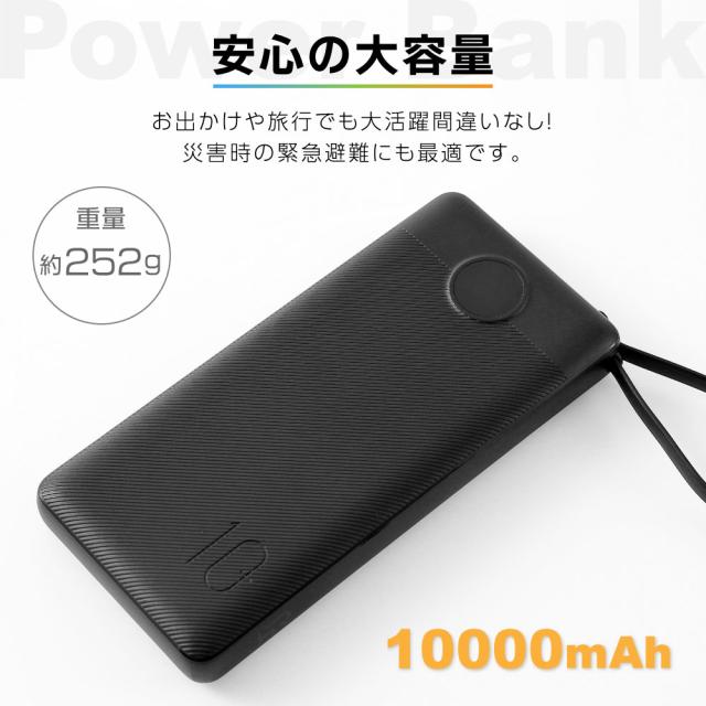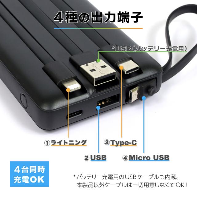 大容量 モバイルバッテリー 10000mAh 4ポート 同時充電 2A 急速 PSE認証 軽量 iPhone 4ケーブル内蔵