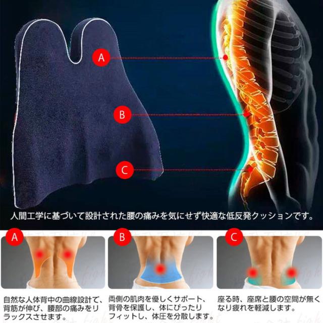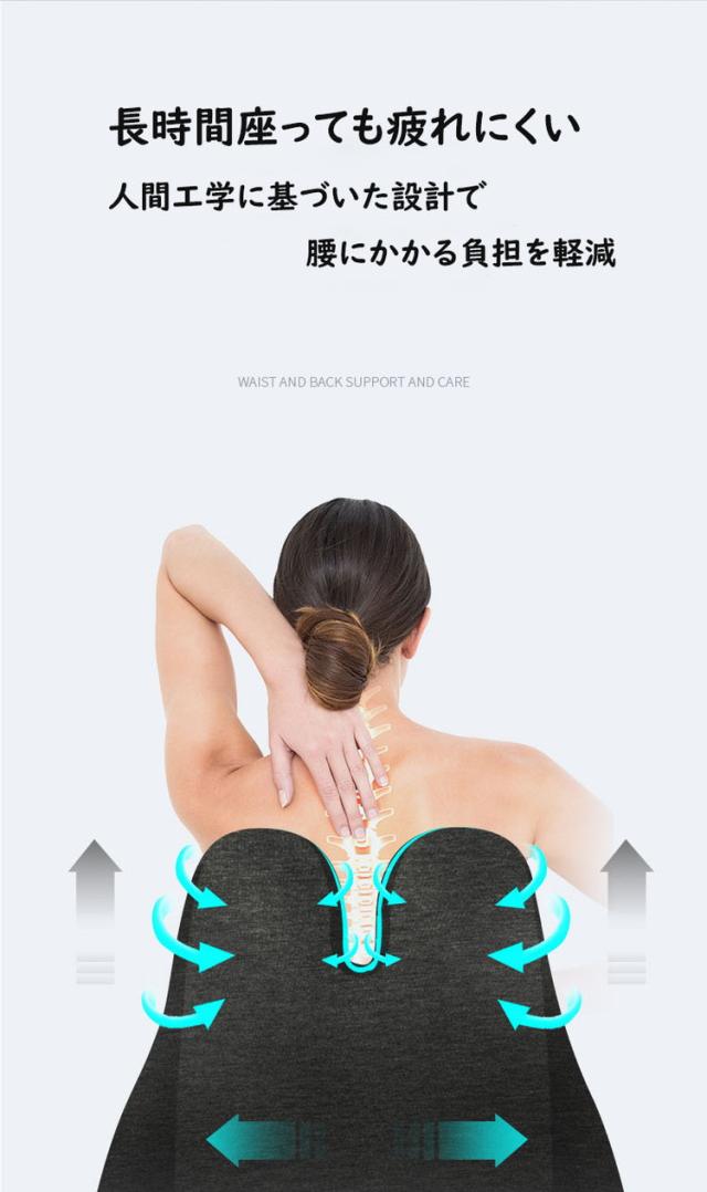 クッションは人体力学に基づいた設計で、腰をやさしく支える科学的な弧状のデザインを採用し、体圧を吸収して尾椎骨、背中、頚椎をほどよいサポートできます、長時間座っても疲れにくいです。