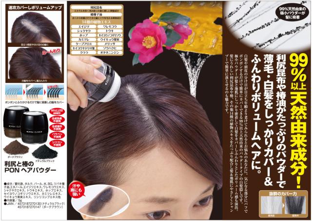 白髪や頭皮の分け目が目立って年齢よりも老けてみられるとお悩みの方に。気になる部分にパフでポンポンするだけで簡単にカバーできるパウダータイプの白髪隠しです。極小パウダーが髪と地肌に密着して白髪をカバーし、ふんわりとしたボリューム感も演出。髪にうれしい利尻昆布や椿をはじめ、14種類の植物エキスをたっぷり配合。髪と地肌にやさしく、シャンプーで簡単に落とせるのも魅力です。