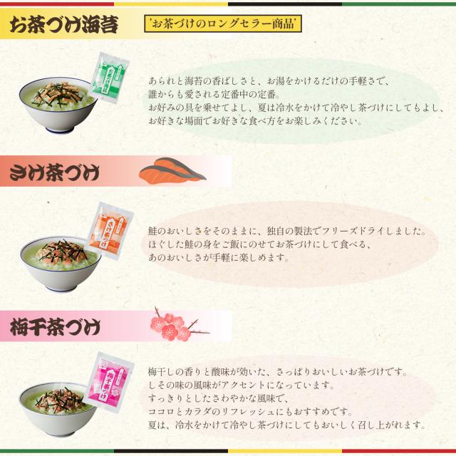 お湯を注ぐだけで、味わい深いお茶づけが簡単にできあがります。海苔、あられ、抹茶の風味が好評のひと味違うおいしさです。さけ、たらこ、うめなどをトッピングしていただくと、よりおいしいお茶づけメニューができあがります。居酒屋、食堂などさまざまな飲食店で、ベースとしてのご使用にも最適です。