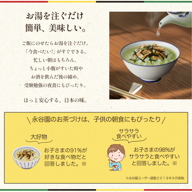 - 永谷園のお茶漬けが3種類入っているので、毎回気分を変えて食べられるのが良いです。家族にも選んで食べられて良いと好評です。