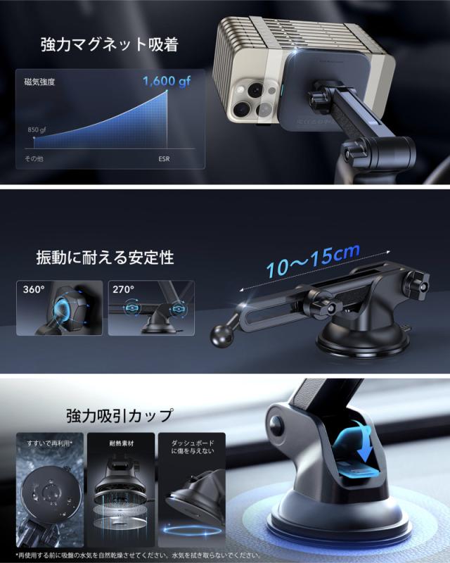 ESR Qi2 15W充電 Magsafe 車載 スマホホルダー 車 Qi2認定Magsafe充電器 ダッシュボード/風防ガラス磁気ワイヤレス車載充電器 iPhone 17/16/15/14/13/12専用 スマホスタンド 車用 マグセーフ充電器 急速充電 ブラック