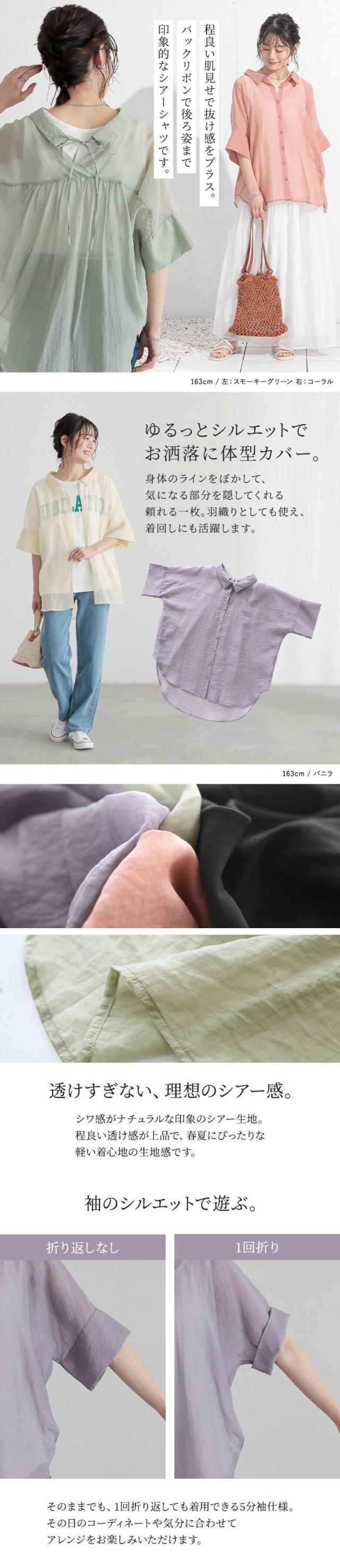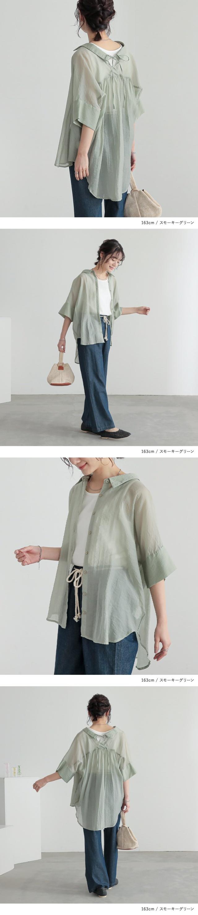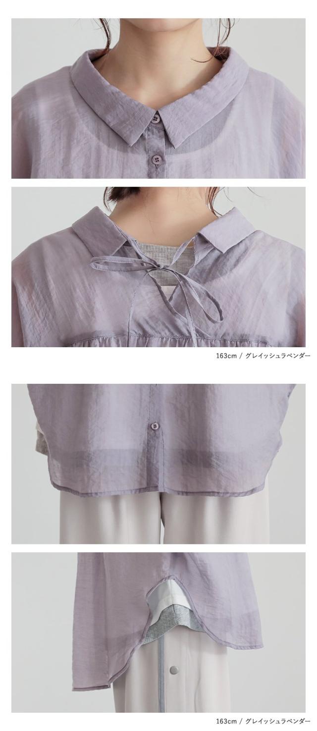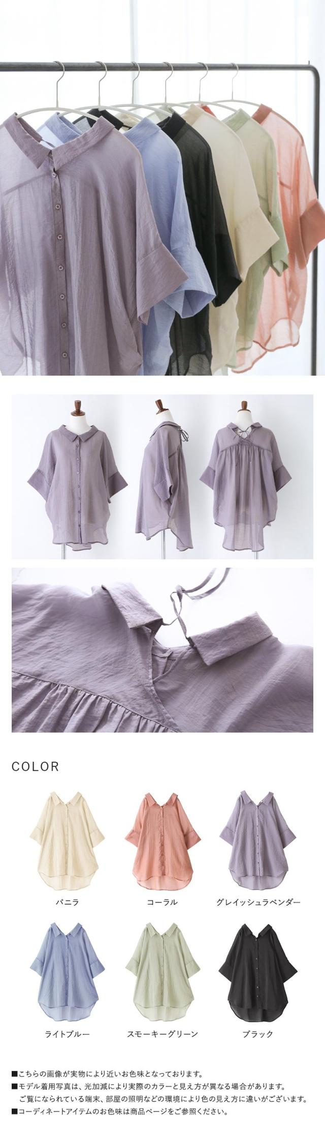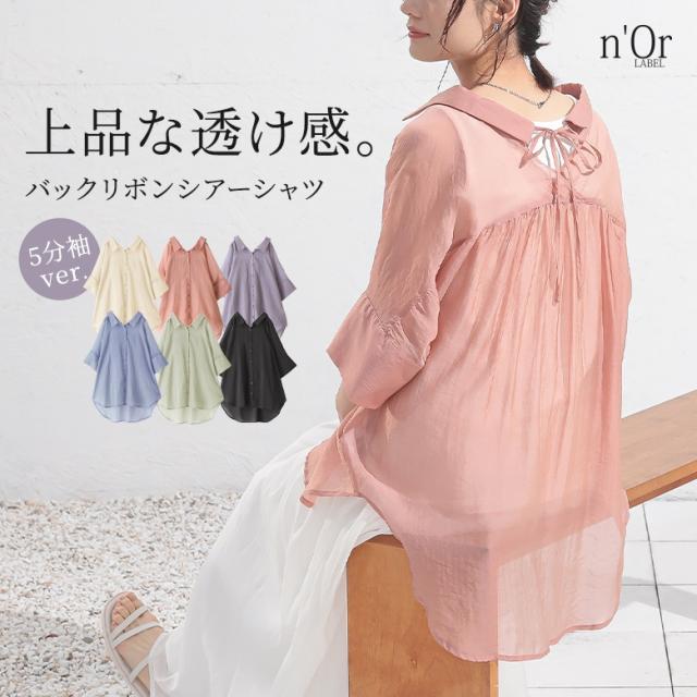 レディース トップス ブラウス シャツ ロングシャツ ボタンシャツ 前開きシャツ 襟付きシャツ 羽織 襟付き 抜き襟 半袖 五分袖 折り返し袖 ワイドスリーブ ドロップショルダー ギャザー ヨーク リボン バックリボン バックシャン 無地 シワ加工 シースルー シアー ラウンドヘム 透け感 レイヤード 重ね着 おうちで洗える 春夏 女子会 カジュアル お出掛け 旅行 リゾート 通勤 通学 お買い物 大人女子 大人可愛い お洒落可愛い 上品 きれいめ モード シンプル ナチュラル ニュアンス ラフ Sサイズ Mサイズ Lサイズ LLサイズ 3Lサイズ XLサイズ フリーサイズ ぽっちゃり 体型カバー 大きいサイズ n'OrLABEL ノア—ルレーベル グリーン 緑 スモーキーグリーン ピンク 桃色 コーラル パープル 紫 グレイッシュラベンダー ブラック 黒 くすみカラー スモーキーカラー バニラ ホワイト 白 ライトブルー 青 水色 sheertops 【トップス】[ID]thn0176