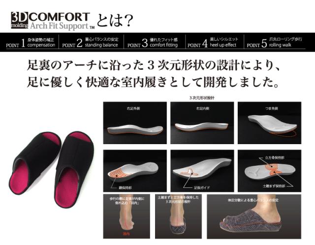 中敷部分には足裏のアーチに沿った3次元形状の設計により、足に優しく快適な室内履きとして開発しました。