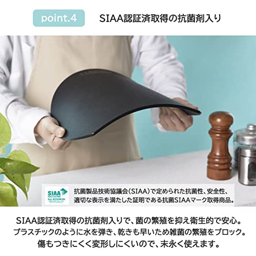「商品情報」包丁との相性の良い木製の感触に似た合成ゴムエラストマーは、刃あたりが柔らかく手の負担が軽減されます。プラスチックのように水の弾きがよく、乾きも早く雑菌の繁殖も防ぎます。傷がつきにくく変形しにくく末永く使えます。抗菌剤入りなので、菌の繁殖を抑え末永く衛生的に安心してお使いいただけます。薄くて軽くて柔らかい!取り扱いもラクラクです。汚れたらサッと一拭き、色もつきにくく汚れも目立たない、食材が映えるシックなブラックカラー。片面に可愛いロゴ入り!素材の使い分けにも活用できます。「主な仕様」商品サイズ:340x290x6mm