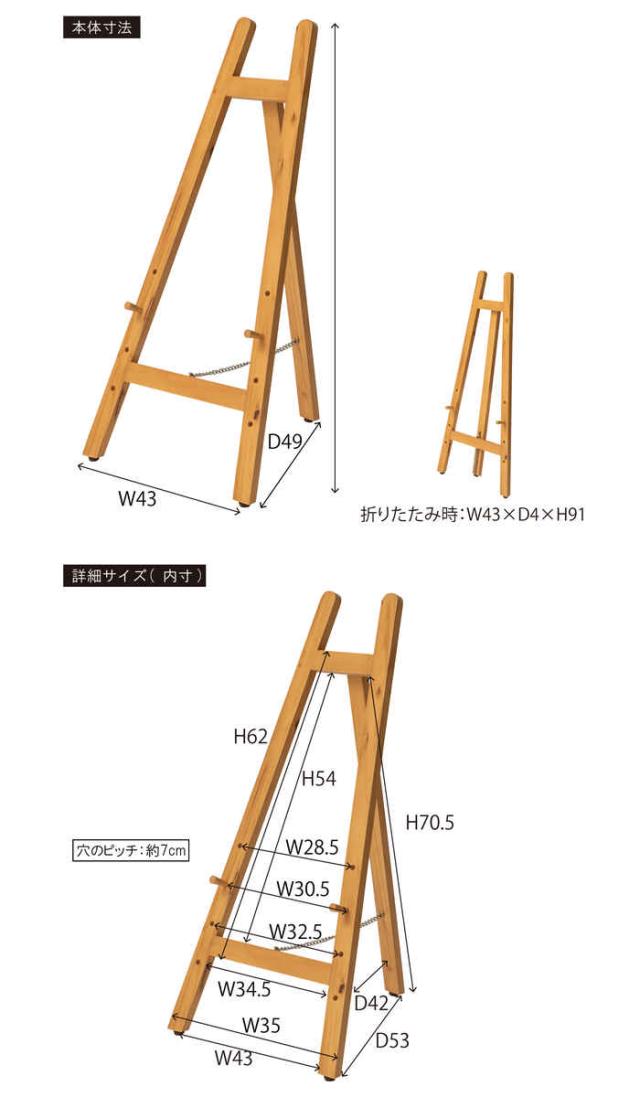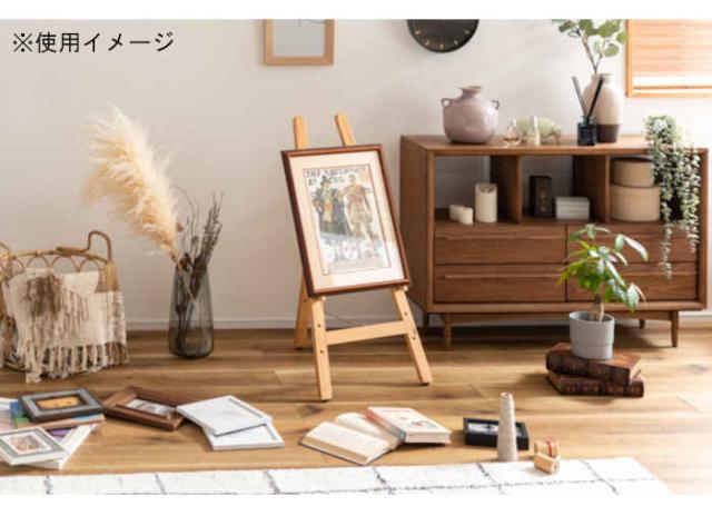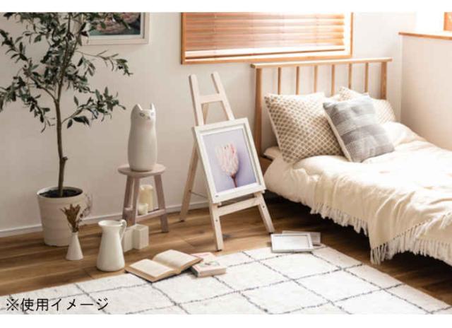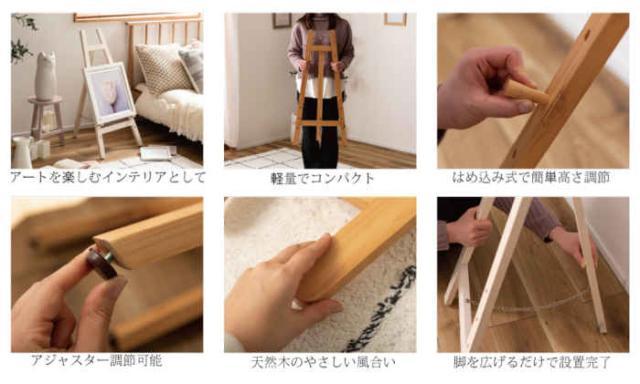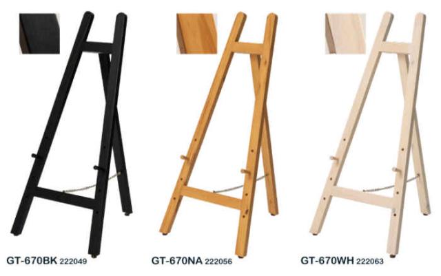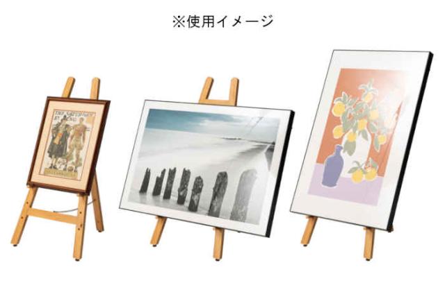 壁や床を傷つけずアートを手軽に飾れるイーゼル。カラーは、ブラック(4985155222049/GT-670BK)、ナチュラル(4985155222056/GT-670NA)、ホワイト(4985155222063/GT-670WH)です。脚にはアジャスター付きで安定性抜群。軽量&コンパクトなので移動や持ち運びもラクラク。アートパネルを飾る高さは4段階の調節が可能。パネルフックははめ込み式なので簡単に調節できます。後ろ脚を広げるだけで設置完了の簡単仕様。前フレームと後ろ脚の間にチェーンが付いているので、脚が広がりすぎる事もなく安心。アートパネルが引き立つ、天然木(パイン)のやさしい風合い。3色展開でさまざまなテイストにマッチします。