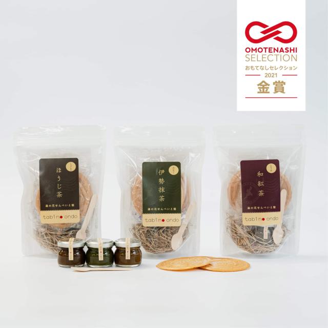 日の出屋製菓の「湯の花せんべいと餡3種のセット」です。京都のコンフィチュール専門・北野ラボの三重県産の3種の茶葉を使ったコンフィチュールを湯の花せんべいに塗ってお召し上がりいただきます。お味は伊勢抹茶×みるく、ほうじ茶×しょこら、和紅茶×とうふの3種類。鈴鹿の伊勢抹茶、松阪の和紅茶、伊勢〜南勢地域のほうじ茶をそれぞれ炭酸せんべいに良く合うコンフィチュールに仕上げています。「おもてなしセレクション2021」では金賞に選ばれました。日の出屋製菓の新ブランド「tabino ondo」(タビノオンド)から湯の花せんべいの新しい食べ方のご提案です。素材で巡る三重の旅。是非お菓子で三重県の旅の温度を感じてください。【日の出屋製菓】昭和32年創業。三重県菰野町(こものちょう)の湯の山温泉御在所岳の麓で、湯の花せんべいを始めとした観光土産菓子を製造・販売しています。