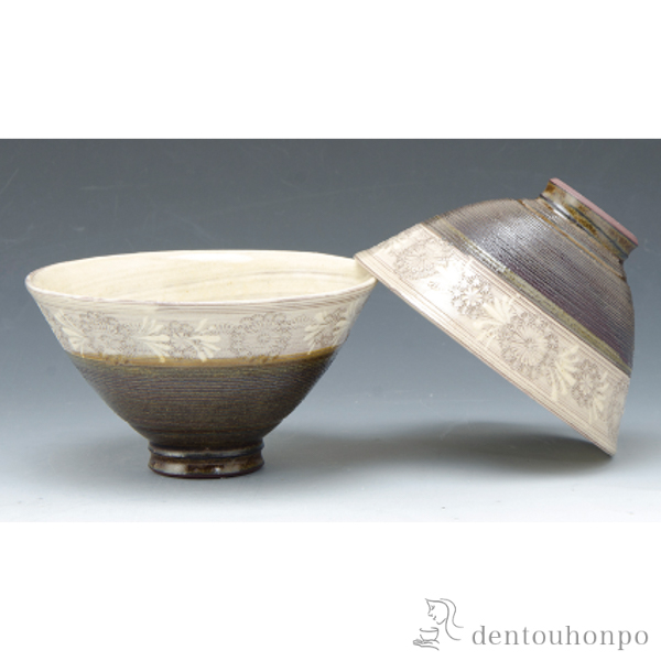 端正な器形に印華紋を丁寧に施し、下部には万線を罫描いて飴釉を掛けたモダンな飯碗です。