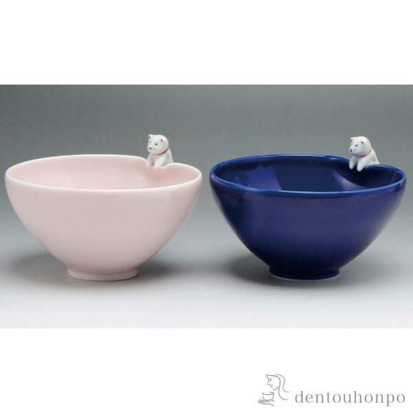うつわの縁から愛らしい子猫がのぞき込んでいます。シンプルな器体の同じサイズのペア飯碗です。