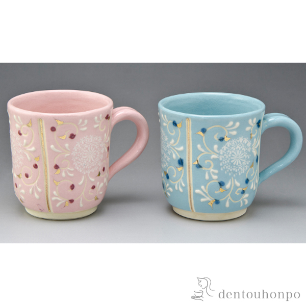 淡いピンクとブルー地に、白色で表現された印華紋が良く調和したペアマグです。金彩や点紋がアクセントになっています。