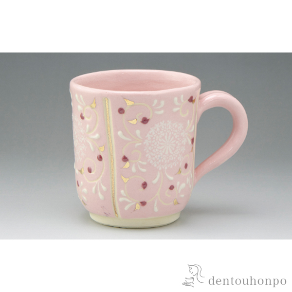 淡く優しいピンク地と白色の印華紋が良く調和したマグです。金彩が程よいアクセントになっています。