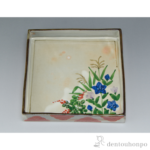 たたらの技法で箱皿の形に作り上げました。図案化された青海波と秋草が見事に調和しています。