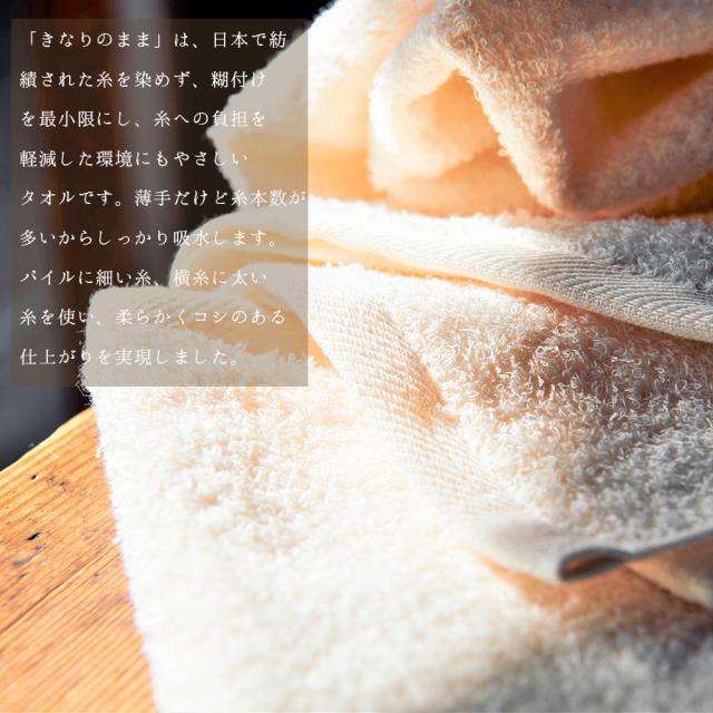 「きなりのまま」は、日本で紡績された糸を染めず、糊付けを最小限にし、糸への負担を軽減した環境にもやさしいタオルです。薄手だけど糸本数が多いからしっかり吸水します。パイルに細い糸、横糸に太い糸を使い、柔らかくコシのある仕上がりを実現しました。