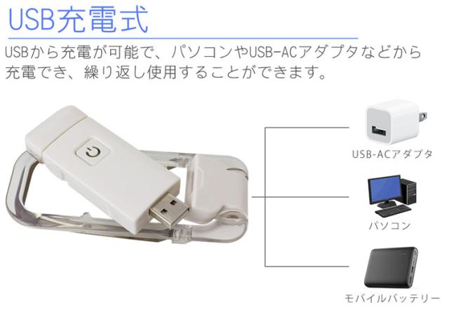 USBから充電が可能で、パソコンやUSB-ACアダプタなどから充電でき、繰り返し使用することができます。