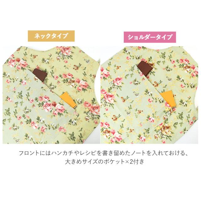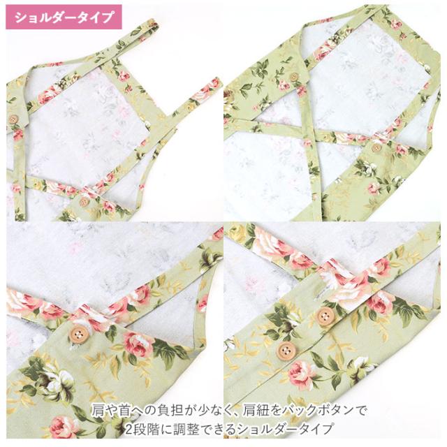 | 商品説明 | ・キッチンも心も華やかにしてくれる花柄エプロン♪ネックタイプとショルダータイプが登場。 ・シワになりにくく普段使いしやすい、コットンとポリエステルの混紡素材を使用。 ・腰紐は前でも後ろでも結ぶことができるから、お好みや気分に合わせて変えてもOK♪ ・フロントにはハンカチやレシピを書き留めたノートを入れておける、大きめサイズのポケット×2付き。 ・お好みに合わせて選べる2タイプをご用意♪ ・首紐の長さ調整が可能でサッと着用できるネックタイプと、肩や首への負担が少なく、肩紐をバックボタンで2段階に調整できるショルダータイプ。 ・家事を頑張っている方への贈り物にもおすすめ。 |