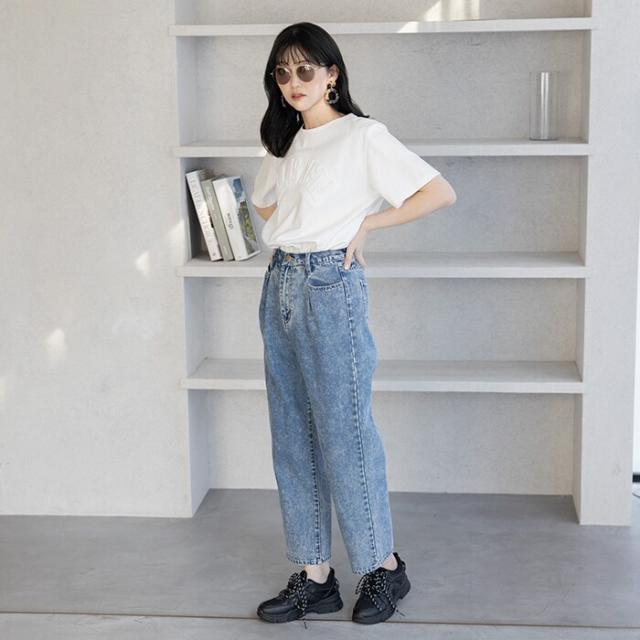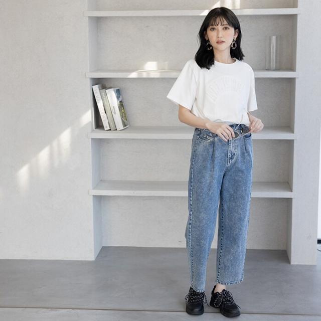 ロゴデザインがおしゃれなTシャツだから、大人カジュアルなスタイリングがおすすめ。