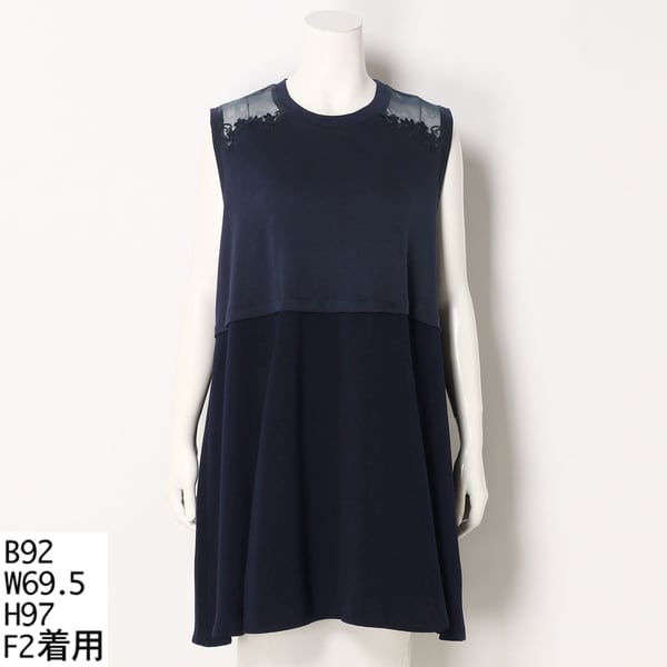 ネックラインからショルダーにあしらったオーガンジーと刺繍が涼しくフェミニンな印象のノースリーブチュニックです。身頃から切り替えたフレア部分は落ち感がありしなやかに揺れるエレガントな印象です。
