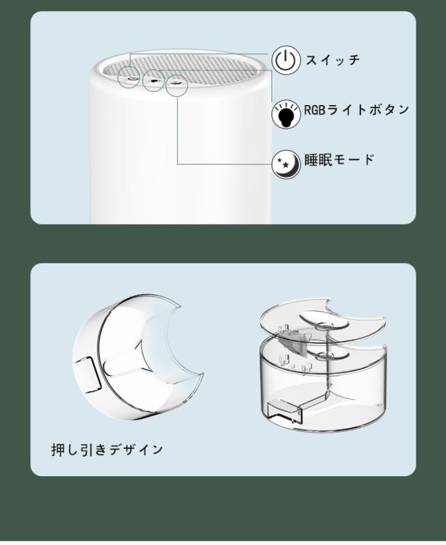 【7色ライト付き自動停止機能】タンクが満タンになると、ライトが赤くなり、自動的に機能が停止します。そのため、滞在中や就寝中の室内乾燥にも安心してお使いいただけます。また、小型除湿機の水槽部分は透明で、除湿現象が一目で確認できるだけでなく、溜まった水部分も7色のライトで視覚的に楽しめます。