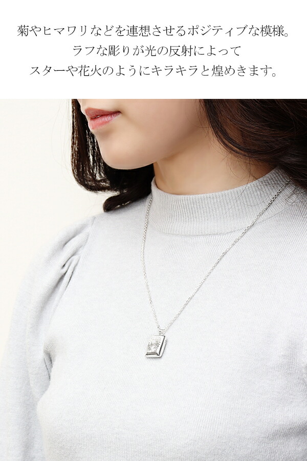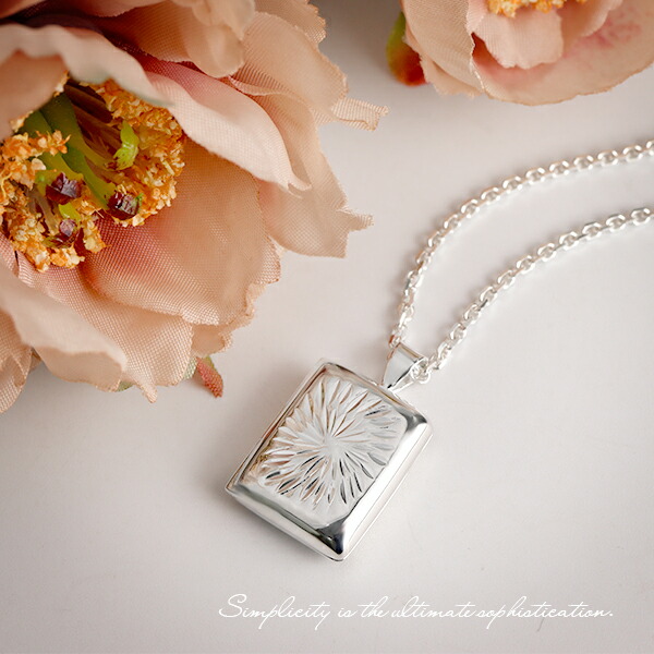 菊やヒマワリなどを連想させる模様が刻まれた、厚みと丸みのあるスクエア型のシルバー製ロケットペンダントです。