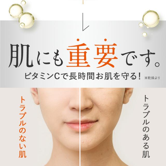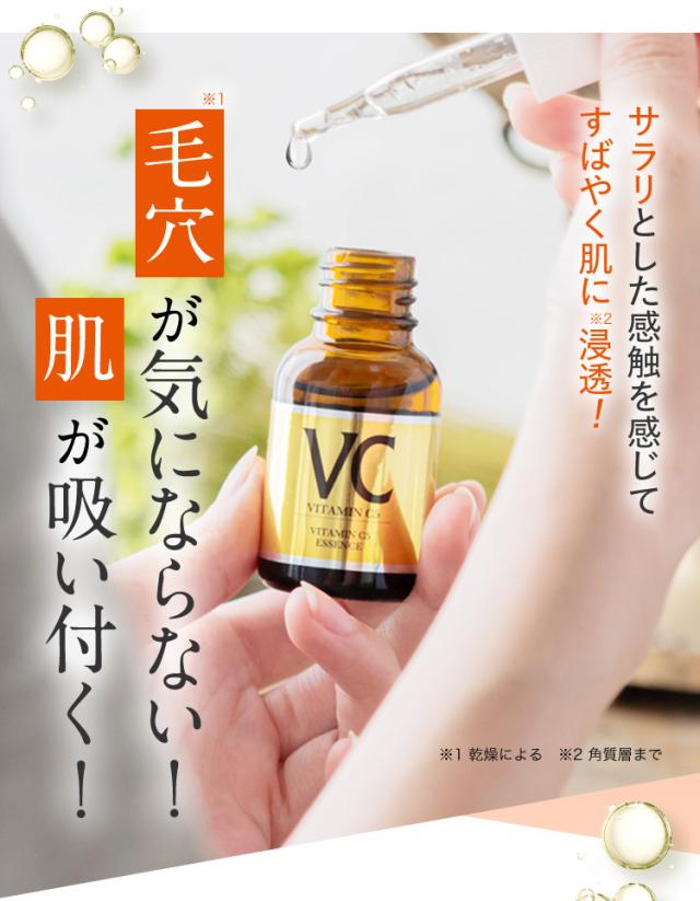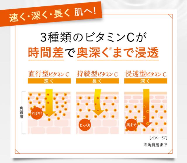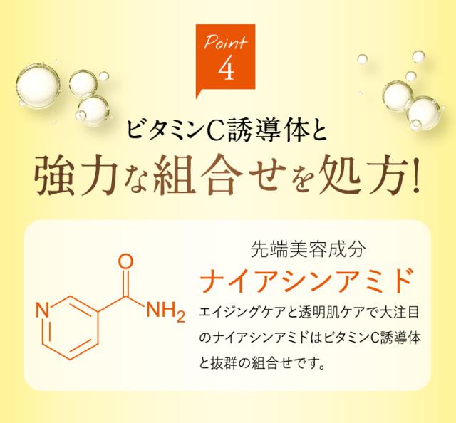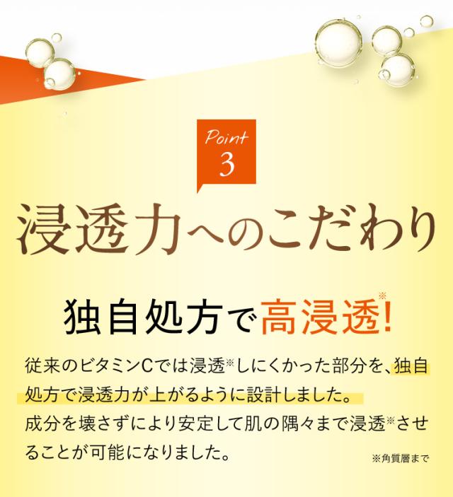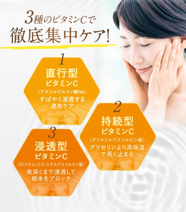 独自処方の3種類の高濃度ビタミンC誘導体を5%以上配合したビタミンc美容液。速く、長く、深くお肌のすみずみにまで働きかけ、ハリ、ツヤなどビタミンCの多彩な美肌効果を存分に発揮してくれます、さらに水を一切使わずに基材を贅沢な「乳酸桿菌/加水分解コラーゲン発酵液エキス」にすることで、美容成分99%を実現。さらに先端の保湿成分ナイアシンアミド、セラミド、ヒアルロン酸などを厳選配合し、浸透力と保湿力をアップ。毛穴※や、年齢肌の悩みを全方位でカバーします。