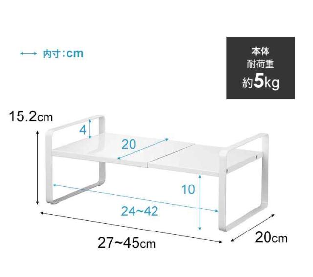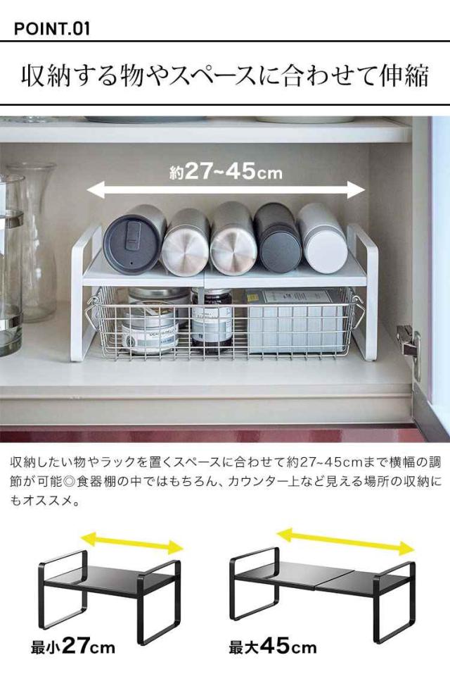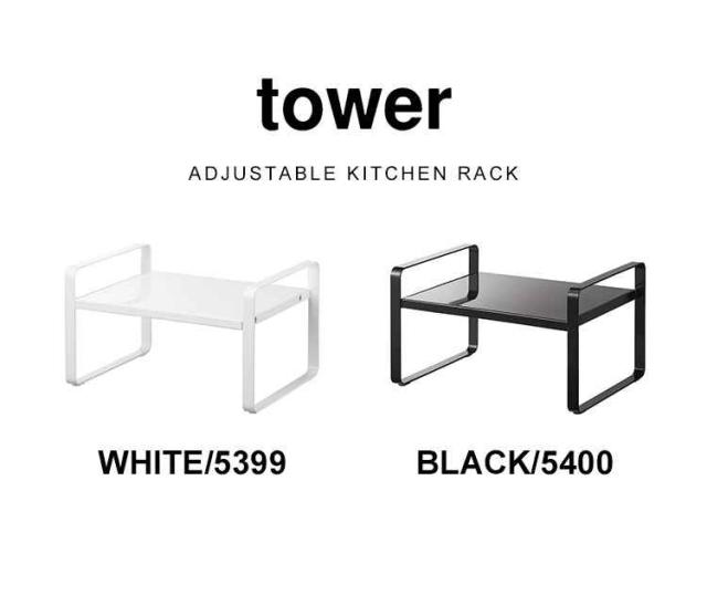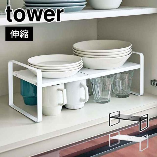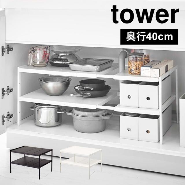 伸縮 収納 ラック 2段 山崎実業 タワー シンク下 カウンター キッチン 洗面台 伸縮式 小さめ スリム コンパクト tower おしゃれ シンプル ブランド 黒 ブラック 白 ホワイト 奥行き20 幅27〜45cm 高さ10cm キッチンラック 収納 新宿棚 洗面下 パントリー 食器棚 隙間収納